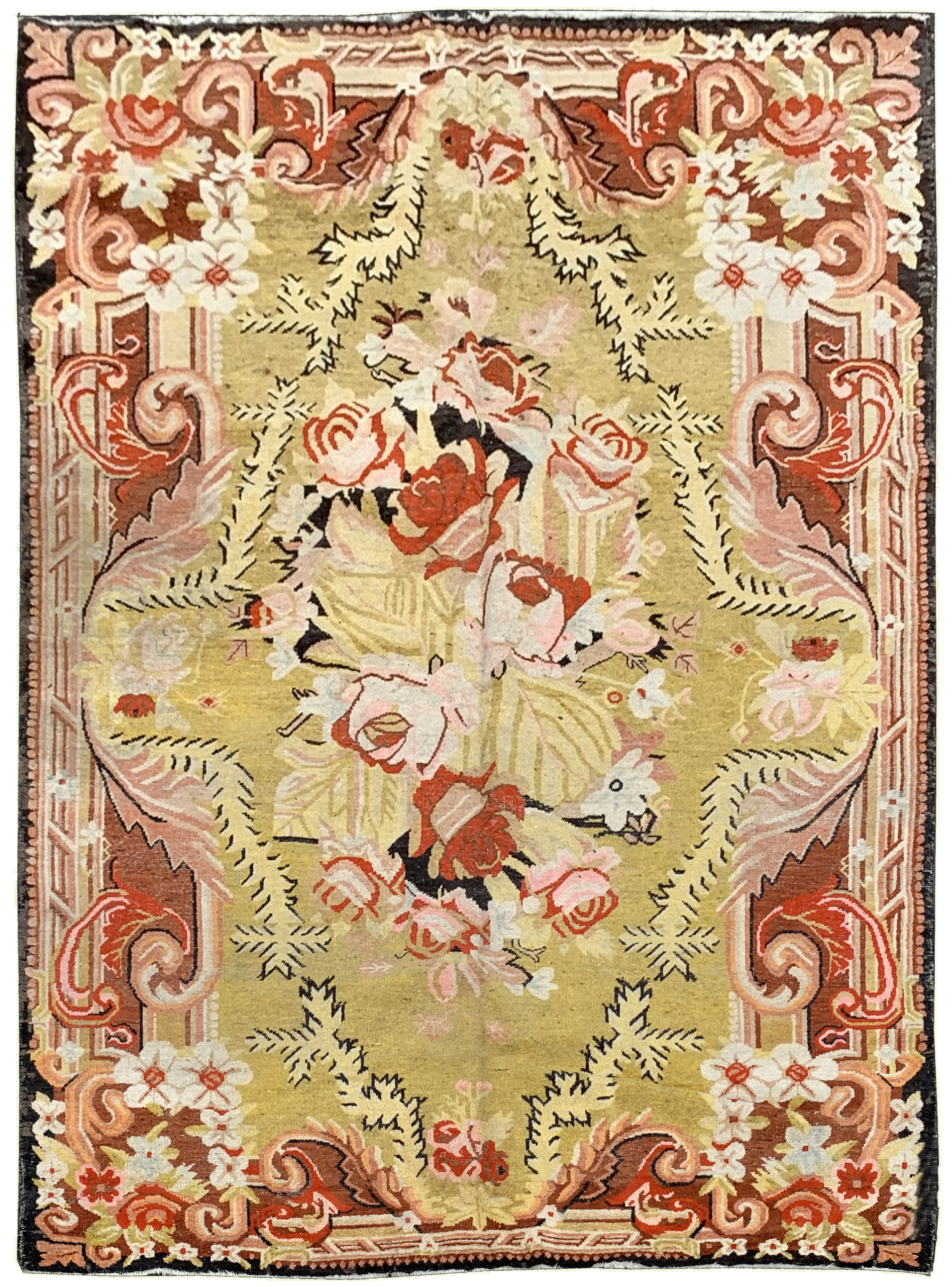 Le travail de tissage repose sur une laine de qualité supérieure, dont la patine naturelle adoucit les contrastes et souligne la profondeur du dessin. La finesse du nouage permet une transition fluide entre les nuances des pétales et des feuillages, conférant au décor une dimension presque picturale. La robustesse de la trame témoigne d’une exécution technique rigoureuse, préservant la netteté des motifs malgré l’ancienneté de l’ouvrage.