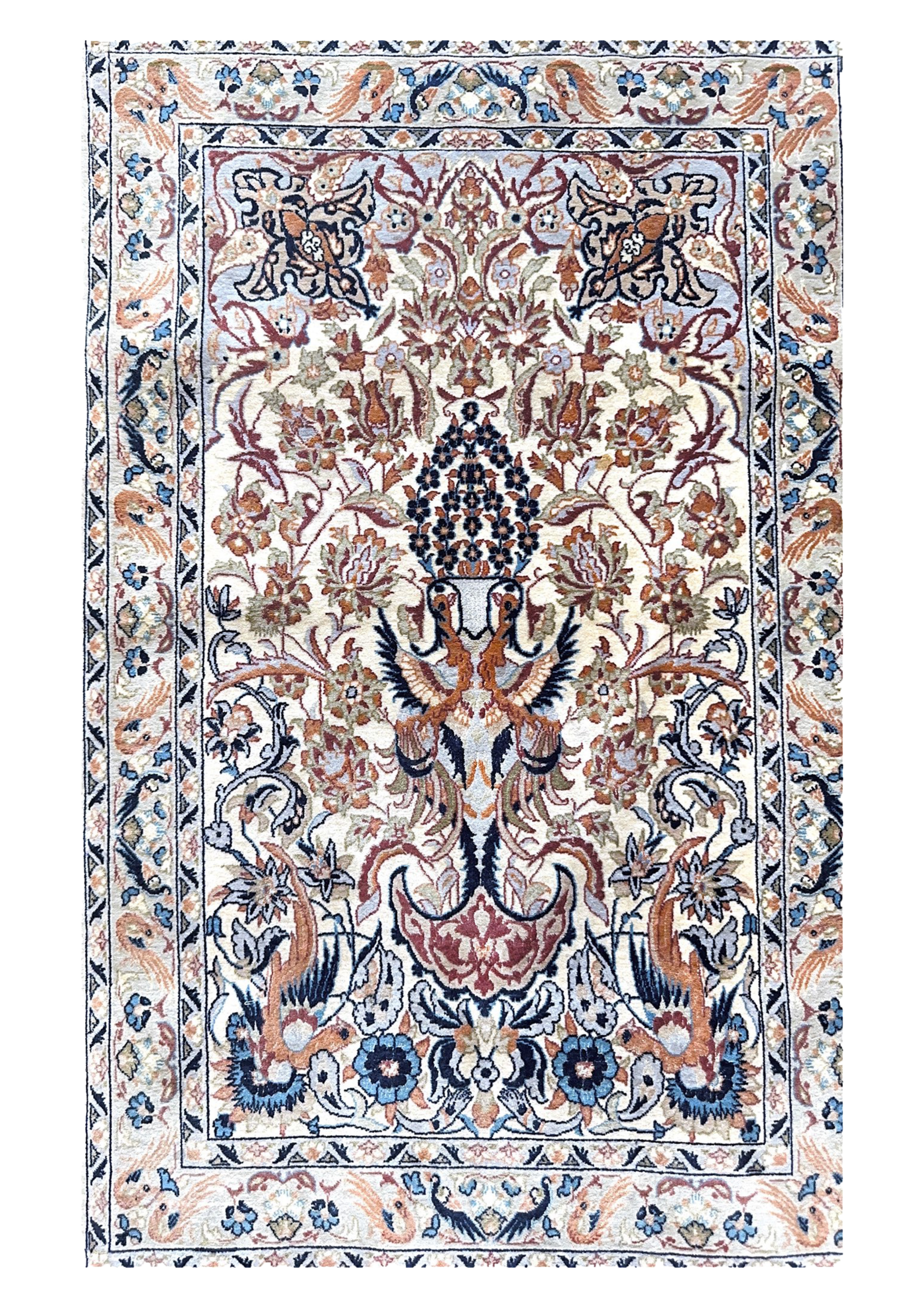 Réalisé sur un format original de 70 x 110 cm, ce tapis se distingue par une densité de nouage manuel particulièrement élevée. Sa composition s’articule autour d’un champ crème ivoire à la luminosité soutenue. Le décor central présente un couple de phénix entouré d’oiseaux de paradis et de bouquets de fleurs stylisées, le tout traité avec une précision qui souligne la qualité technique de l’exécution.