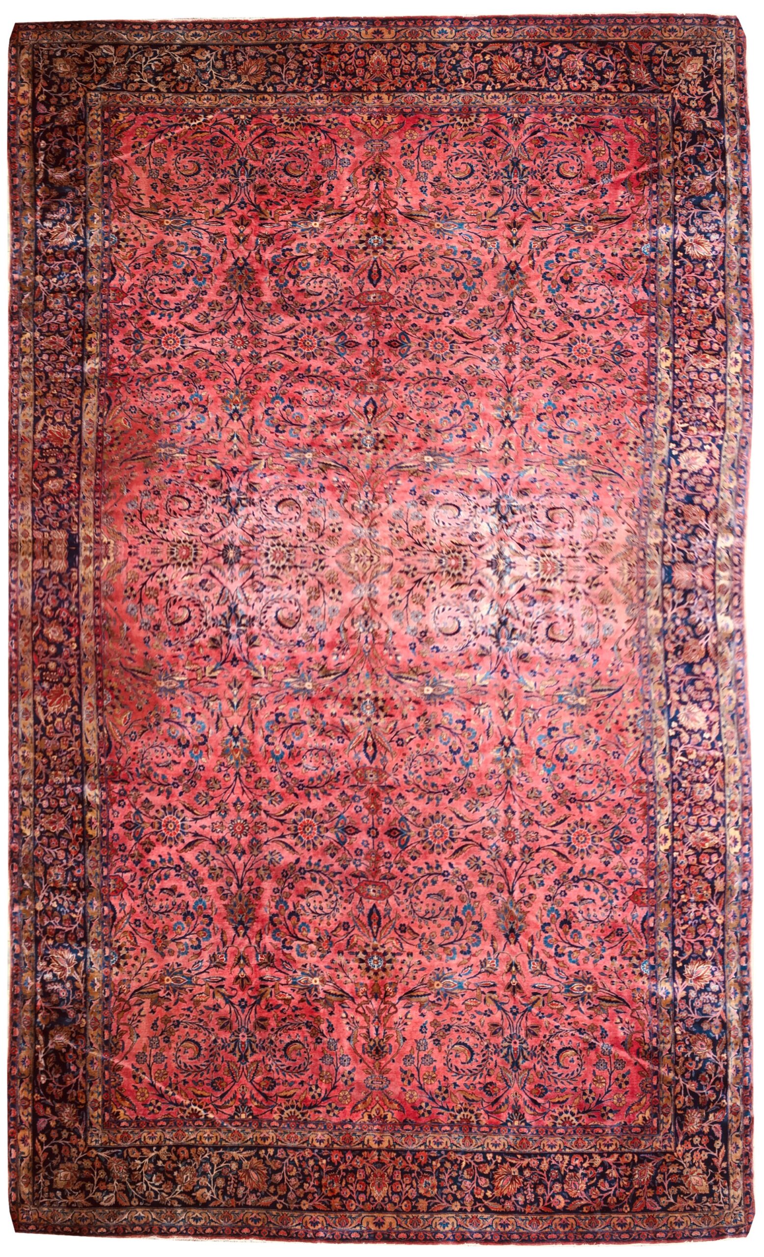 D’une grande envergure de 5,95 x 3,50 m, ce tapis de Kachan réalisé vers 1920 illustre le classicisme des ateliers impériaux de l’époque. La structure s’affranchit du médaillon central pour privilégier un décor continu de rinceaux fleuris, de palmettes et d’arabesques. Ce dessin « all-over » permet une lecture fluide de la surface, où la répétition des motifs floraux crée une perspective sans limites, encadrée par une bordure principale à la géométrie rigoureuse.