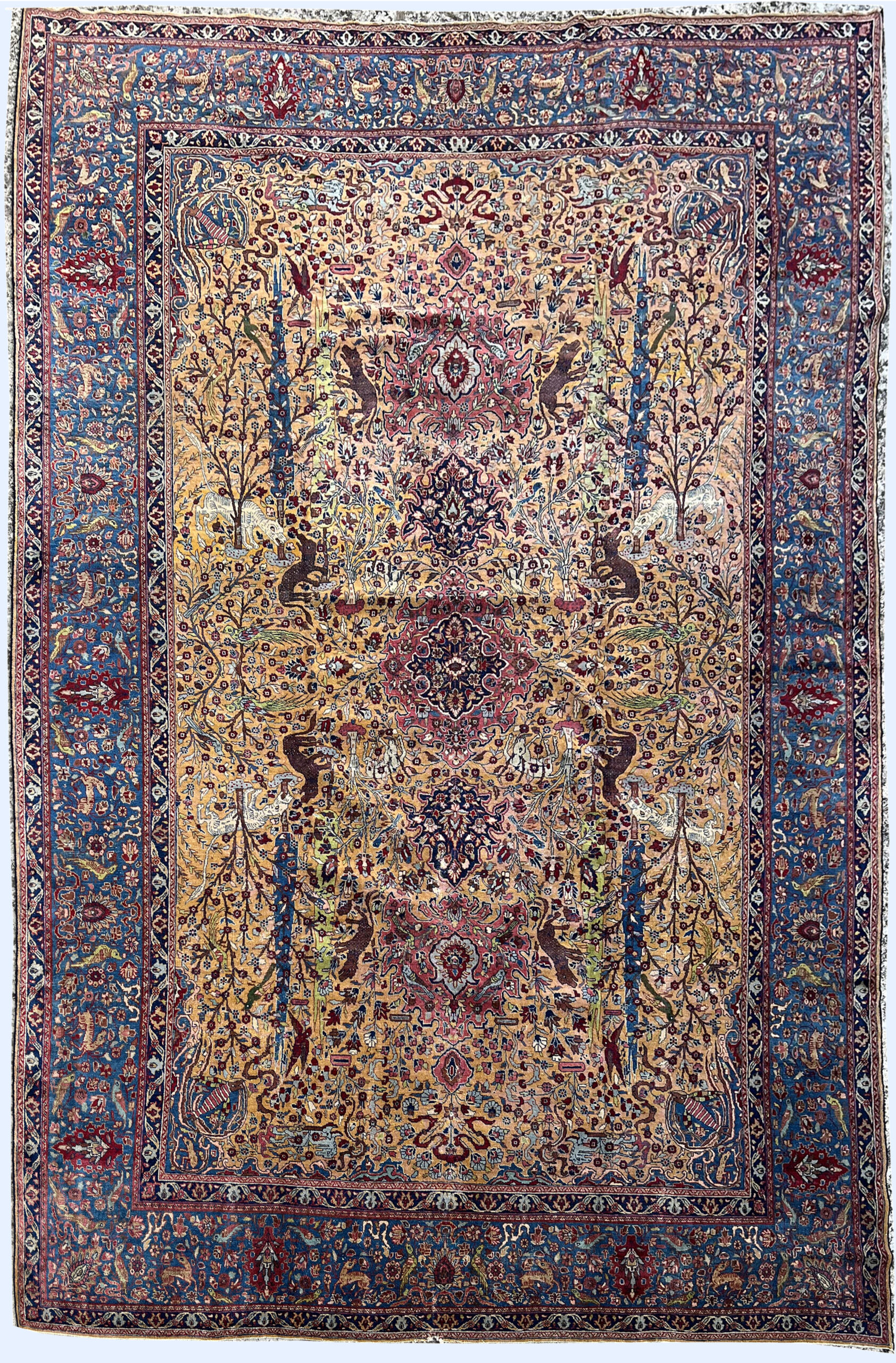 D’un format monumental de 4,80 x 3,35 m, ce tapis de Kerman se distingue par une composition figurative complexe associant un bestiaire animalier à un répertoire floral dense. Le champ central, de couleur ocre doré, accueille des représentations de gazelles et d’oiseaux exotiques disposés autour d’arbres de vie. Un triple médaillon polylobé structure l’espace, assurant l’équilibre entre la dynamique des motifs animaliers et la rigueur de la composition classique.