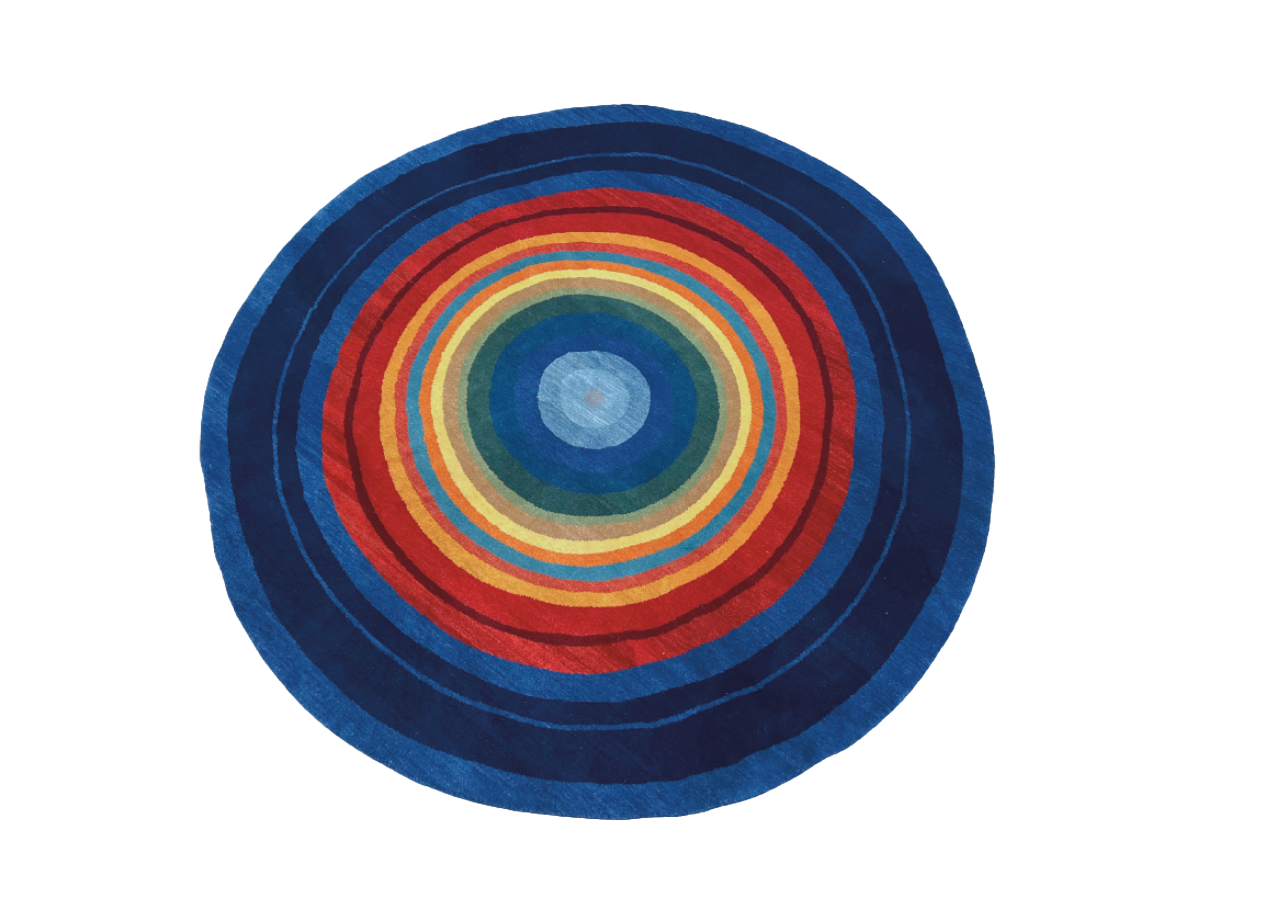 Le modèle MT 198 Aura, issu de la collaboration avec l’artiste Pierre Kiandjan, s’inscrit dans l’héritage de l’art optique (Op Art) appliqué à la création textile. Rompant avec les formats rectangulaires classiques, ce tapis circulaire déploie une succession d’ondes chromatiques. Le dialogue entre les anneaux bleu nuit et les strates vibrantes de rouge, d’ocre et de vert émeraude crée une illusion d’un mouvement perpétuel, évoquant la résonance d’une onde d’énergie ou la structure d’un astre en expansion.