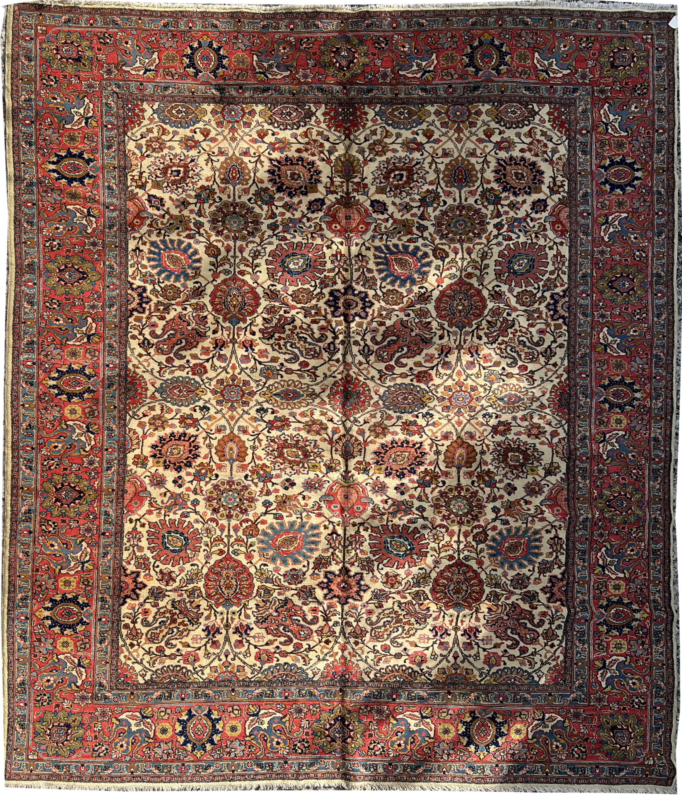 D’un format de 4,15 x 3,00 m, ce tapis Tabriz réalisé vers 1930 est représentatif de la production de l’Azerbaïdjan persan de l’entre-deux-guerres. La composition se déploie selon un dessin « all-over », sans médaillon central, favorisant une continuité visuelle sur l’ensemble de la surface. Le décor est constitué d’un réseau dense de palmettes de type Shah Abbasi, de rinceaux et de fleurs de lotus, articulés avec une symétrie rigoureuse.