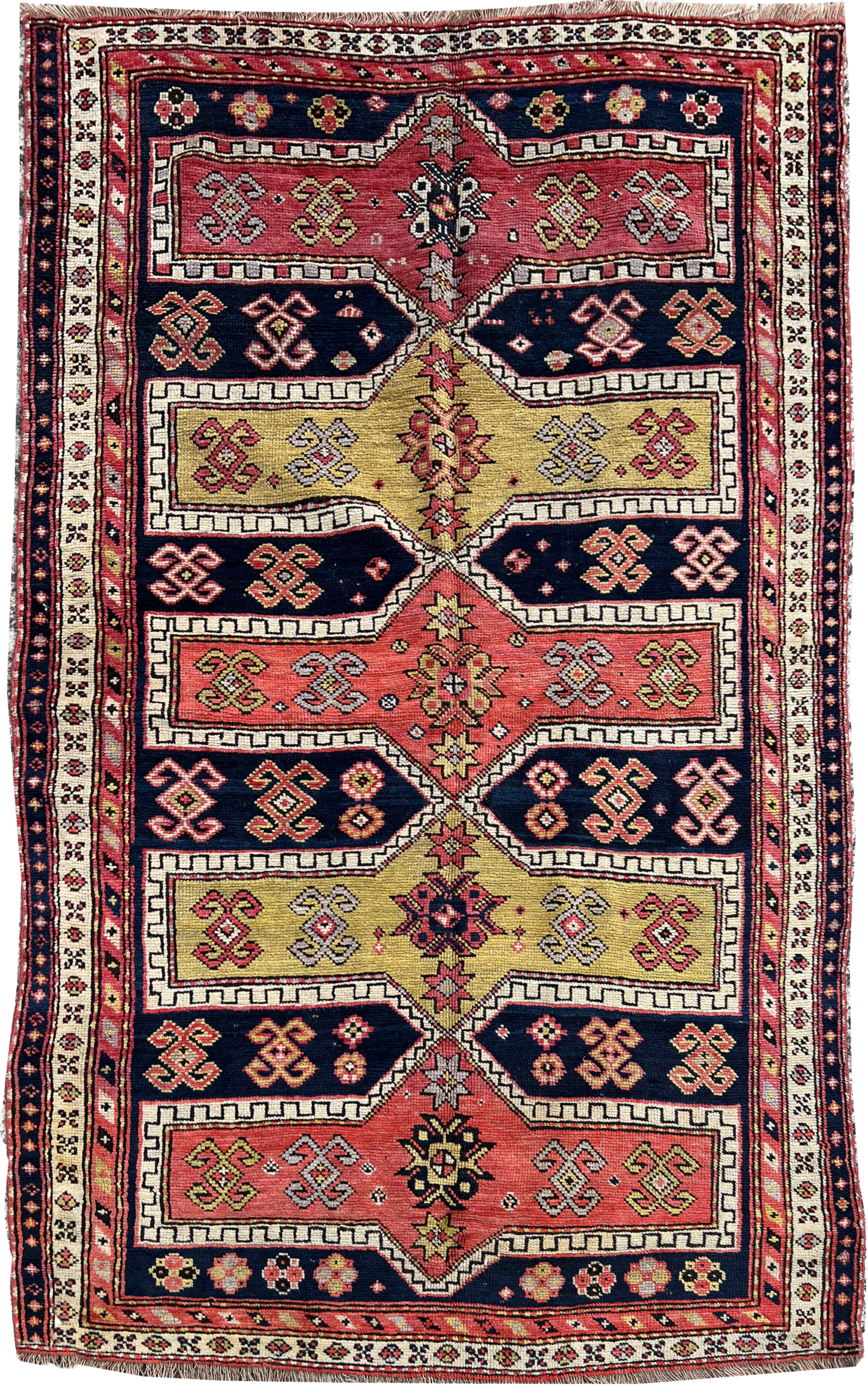 Originaire du Caucase et datant du XIXe siècle, ce tapis Chirvan se définit par une composition verticale rythmée par une succession de médaillons hexagonaux imbriqués. Cette structure géométrique crée un effet de perspective propre aux productions caucasiennes anciennes, offrant une présence graphique qui structure l’espace avec rigueur.