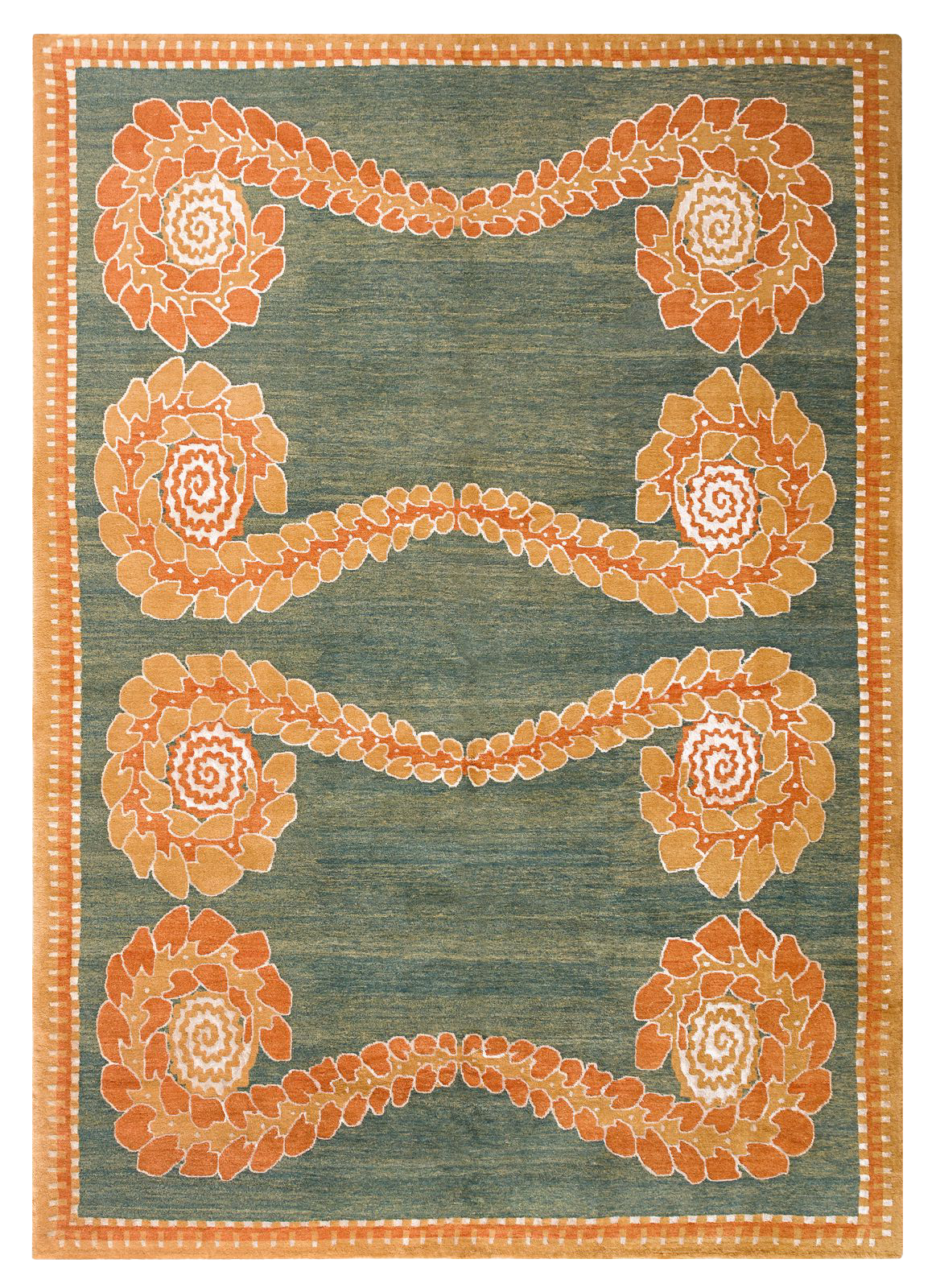 Le modèle MT 33 Sadaf repose sur un répertoire de formes organiques inspirées du milieu marin. La composition s’articule autour de spirales orange cuivré aux contours dentelés, dont la silhouette évoque les structures coralliennes. Ces motifs sont disposés de manière symétrique sur un champ vert de gris, créant un contraste thermique et visuel qui structure la surface sans l’encombrer.