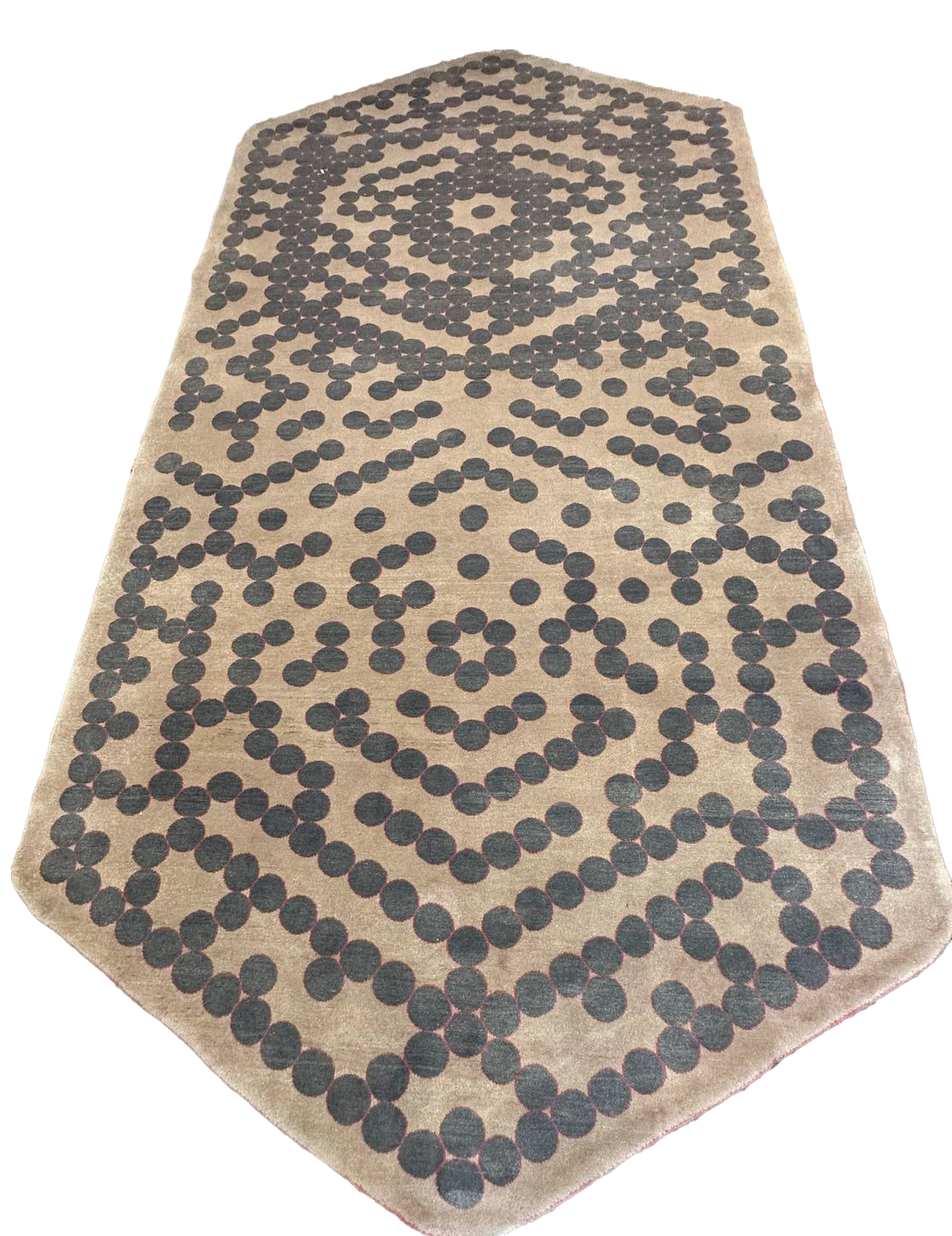 L’approche artistique de cette œuvre privilégie afin de créer un motif unique. Le tapis s’affranchit de la planéité classique pour proposer une expérience sensorielle où le rythme des motifs circulaires induit un relief subtil. Le contraste entre la luminosité douce du support et la rigueur sombre des motifs apporte une énergie sereine et une structure architecturale unique, transformant l’espace en une installation d’art contemporain.