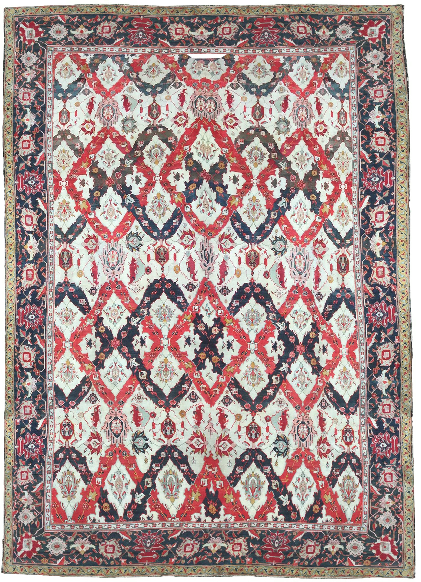 Cette pièce monumentale de 7,00 x 5,00 m, originaire des ateliers d’Agra, date du XIXe siècle. Sa structure repose sur un réseau de treillis en losanges où s’inscrivent des palmettes et des compositions botaniques généreuses. Le dessin, d’une grande rigueur architecturale, se déploie sur l’ensemble du champ central sans saturation, encadré par une série de bordures sophistiquées qui soulignent les proportions impériales du tapis.