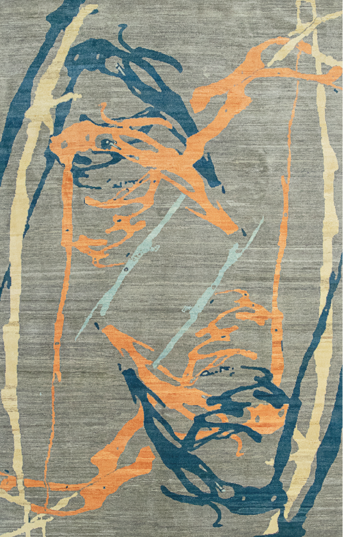 Le modèle MT 152 Anvar 2 s’inscrit dans une démarche artistique où le textile devient le support d’une calligraphie libre et fluide. Sa composition repose sur des lignes organiques qui semblent en mouvement, déclinées dans une palette associant l’orange cuivré, le bleu pétrole et la crème. Ce graphisme spontané se détache sur un champ gris minéral, créant un contraste chromatique qui apporte une profondeur visuelle immédiate et une dynamique contemporaine à l’espace.