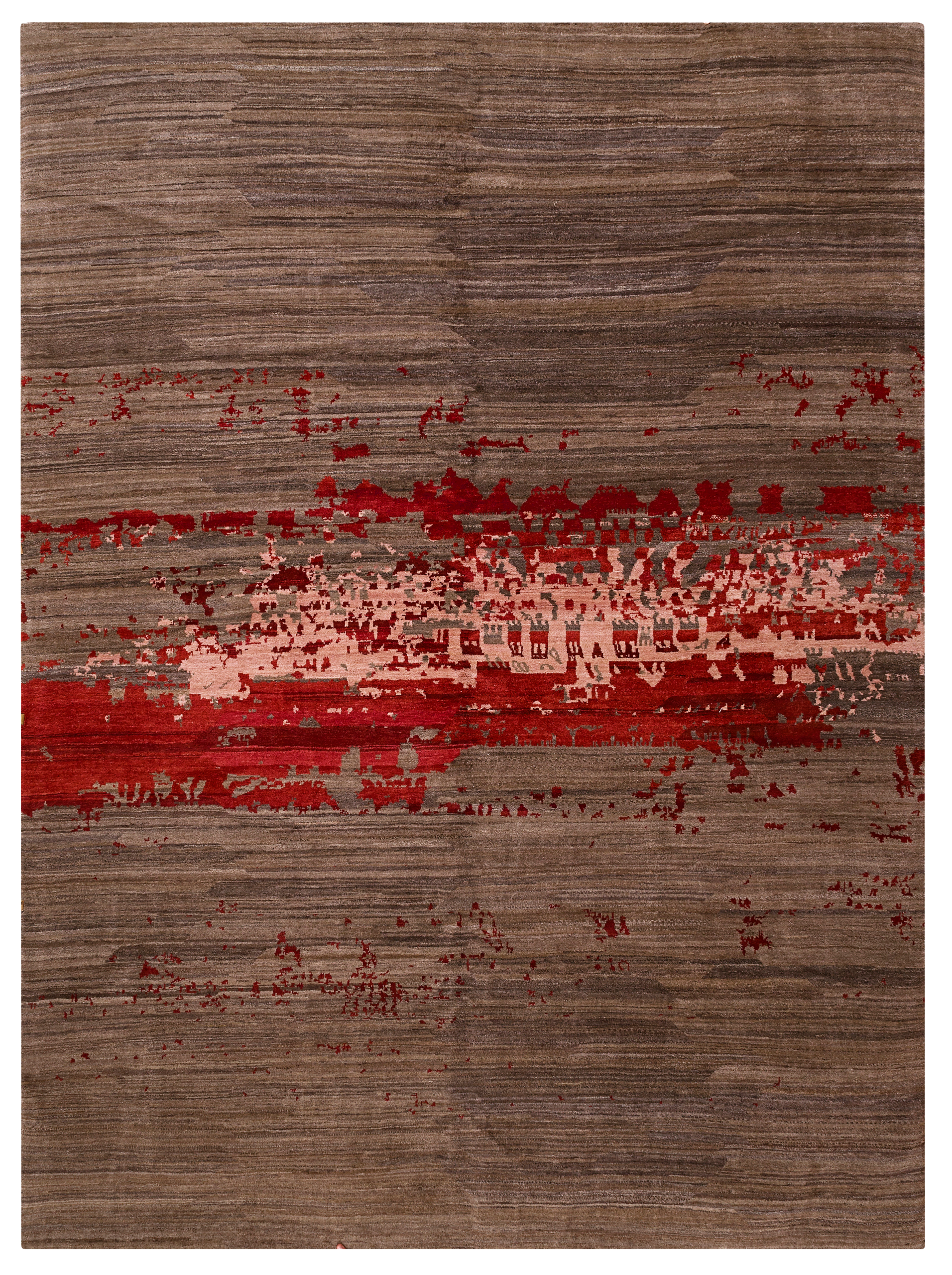 L’identité artistique de ce tapis repose sur la profondeur des pigments et le travail des fibres. L’utilisation de matériaux nobles permet de créer des jeux de lumière où les bruns profonds s’animent, offrant un relief naturel qui souligne l’intensité de la « faille » centrale. La densité exceptionnelle du tissage assure une tenue parfaite et une pérennité technique, transformant ce textile en une véritable signature sculpturale au sol.