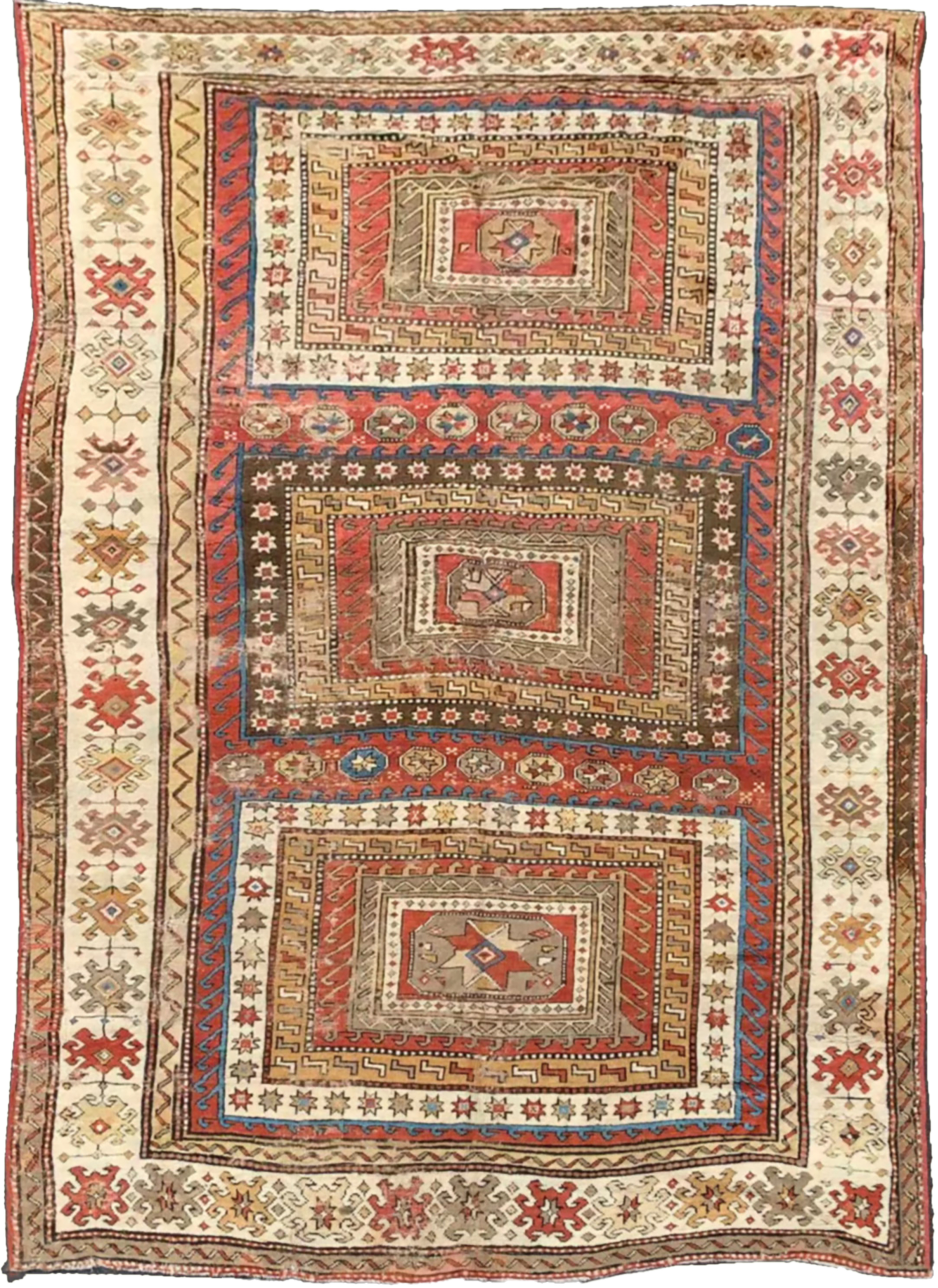 D’une dimension de 3,00 x 2,00 m, ce tapis originaire de Turquie date du début du XIXe siècle. La composition est structurée par trois médaillons rectangulaires alignés verticalement, accueillant en leur centre des étoiles à huit branches. Cette iconographie géométrique est encadrée par une bordure principale à fond clair, ornée de motifs tribaux stylisés caractéristiques de la production anatolienne de cette époque.