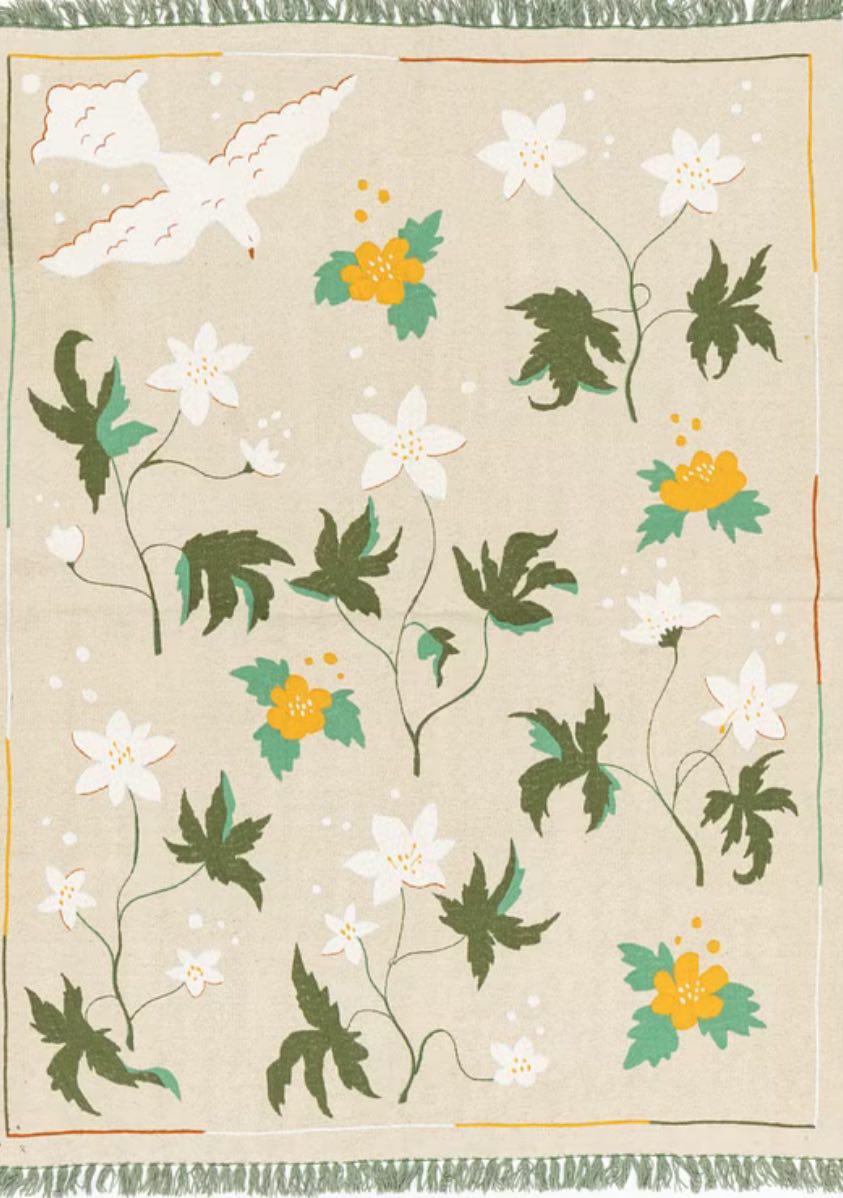 Laissez-vous charmer par la délicatesse du tapis Murmures chantés, une pièce qui célèbre la poésie de la nature. Son fond crème lumineux accueille une envolée de fleurs blanches et jaunes, survolées par un oiseau aux traits aériens. Ce design bucolique insuffle une atmosphère sereine et printanière à votre intérieur.