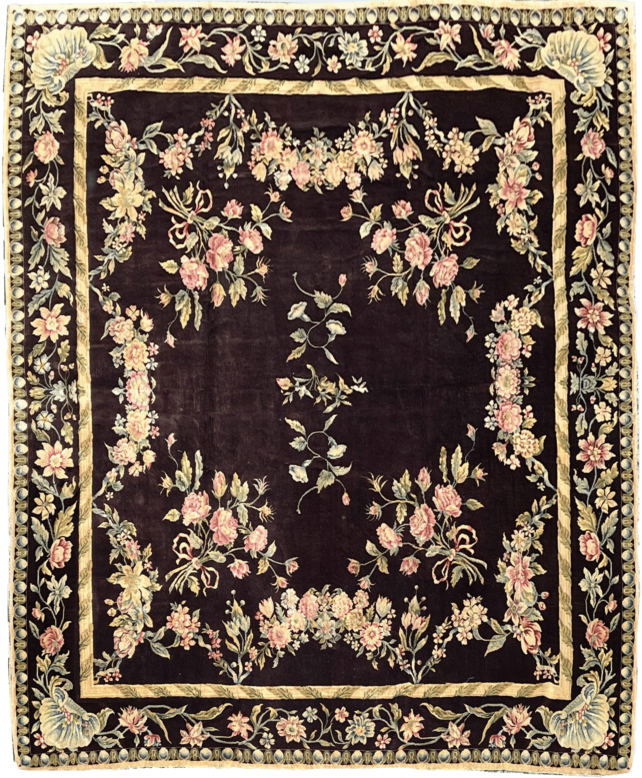 L’encadrement intérieur est marqué par une bordure fine en ruban torsadé beige. La bordure principale, également sur fond sombre, est ornée d’une frise continue de fleurs, de feuillages et de coquilles stylisées dans les écoinçons. Une lisière extérieure à motifs d’oves et de perles vient terminer l’ouvrage. La palette chromatique utilise des nuances de rose poudré, de jaune ocre et de vert amande sur un fond contrasté, caractéristiques des productions de prestige de la fin du XIXe siècle et du début du XXe siècle.
