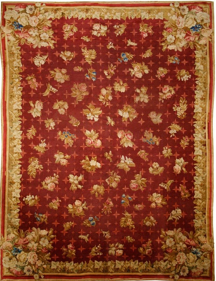 Ce tapis de style Savonnerie d’époque 1800 présente des dimensions de 4,80 x 3,60 m. La composition se caractérise par un champ central rouge profond, structuré par un fin treillage régulier de motifs en forme de croix. Sur l’ensemble de cette surface, des bouquets de fleurs aux tons crème, rose et bleu sont disposés de manière asymétrique, créant un effet de semis floral.