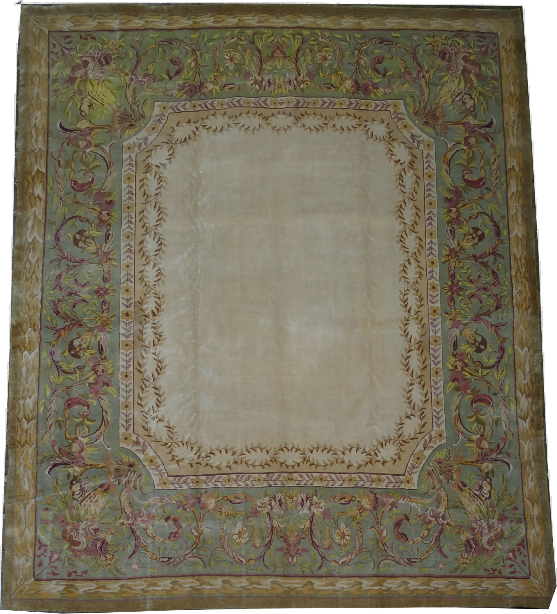 Ce tapis Savonnerie, présente des dimensions de 4,35 x 3,00 m. La composition se caractérise par un large champ central uni de couleur beige, dépourvu de médaillon. Ce panneau central est délimité par une première bordure intérieure rythmée par une frise de feuilles stylisées et de petites fleurs.