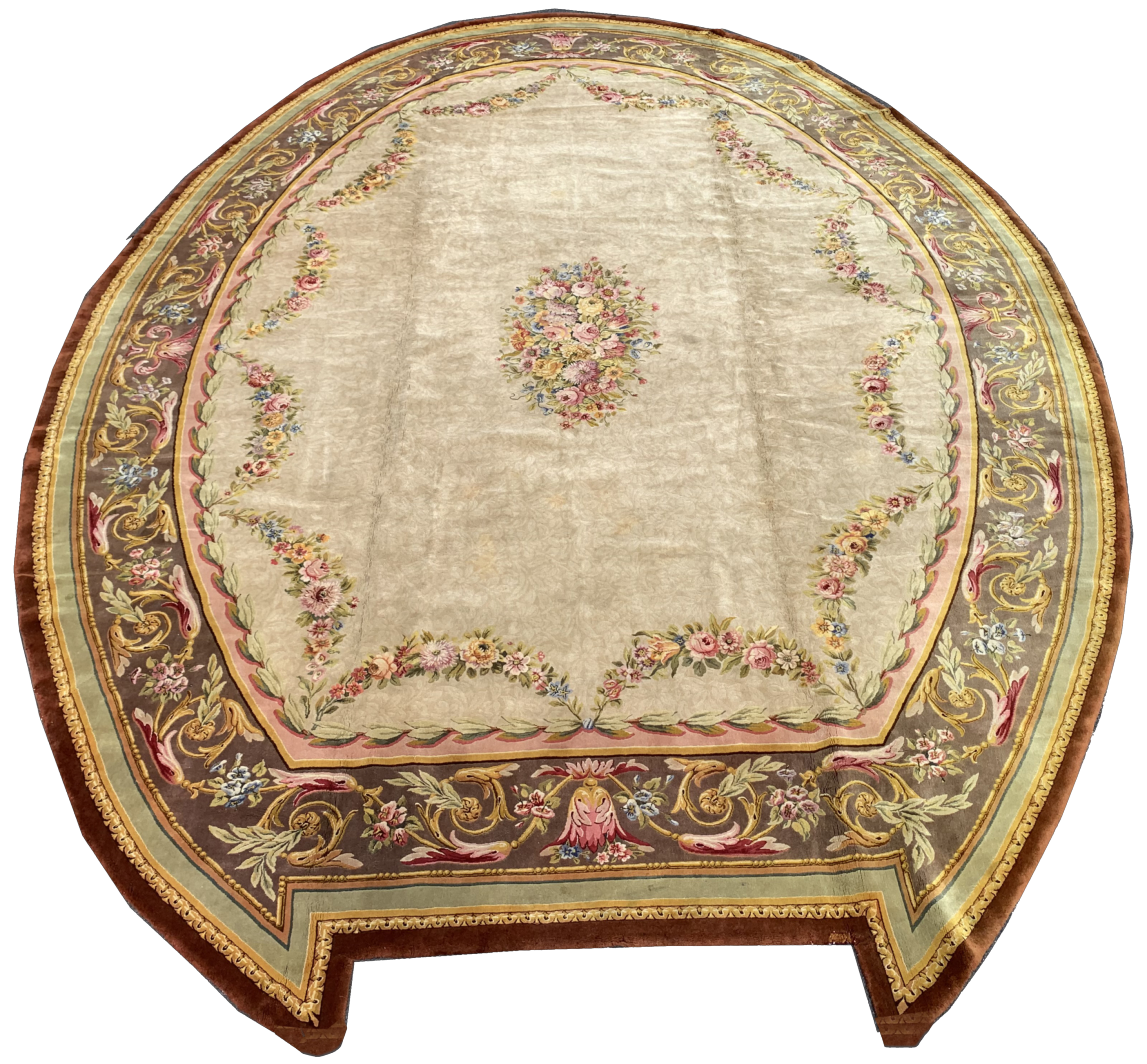 Ce tapis de style Savonnerie datant de 1920, présente des dimensions de 6,00 x 4,60 m. Sa forme ovale est interrompue par deux découpes rectangulaires symétriques sur l’un de ses grands côtés, adaptant la pièce à une architecture spécifique. La composition s’organise autour d’un bouquet de fleurs polychromes central, disposé sur un champ beige clair à l’aspect velouté.